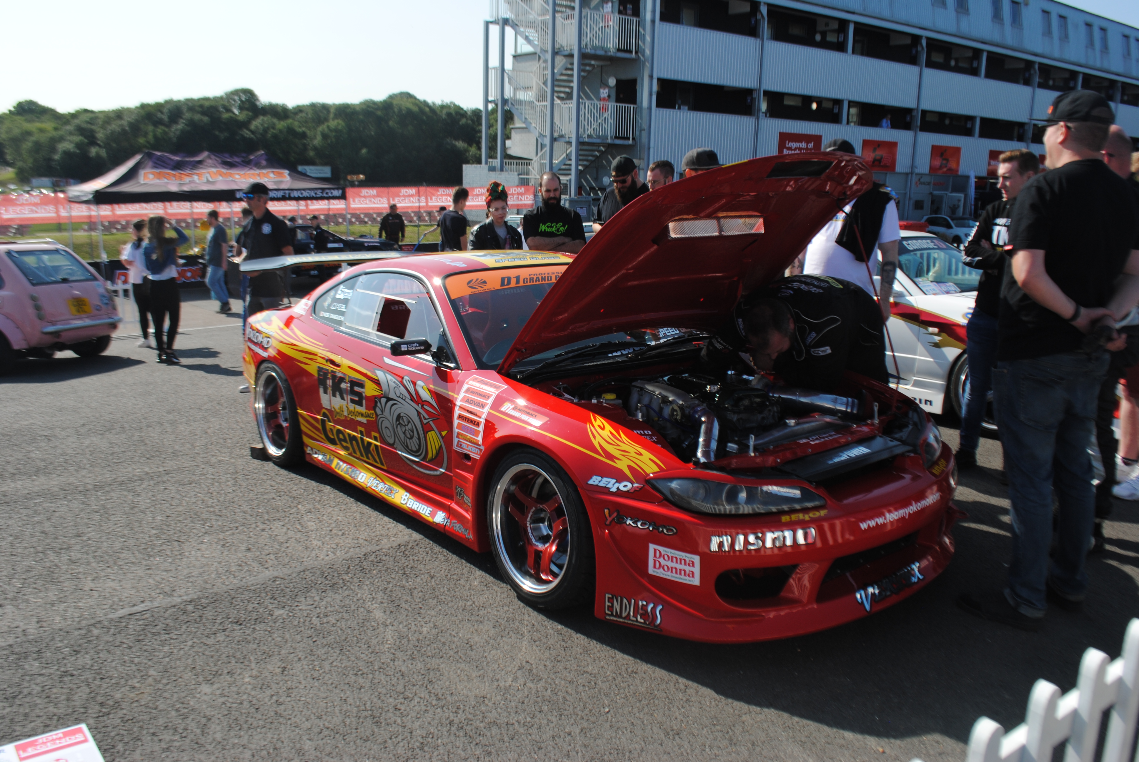 The two drift cars went out with a host of other drifters in the drift demos. The pits were closed off because of Covid, but thankfully the drift cars were pitted up in the show and shine area so I could go and be nosy.