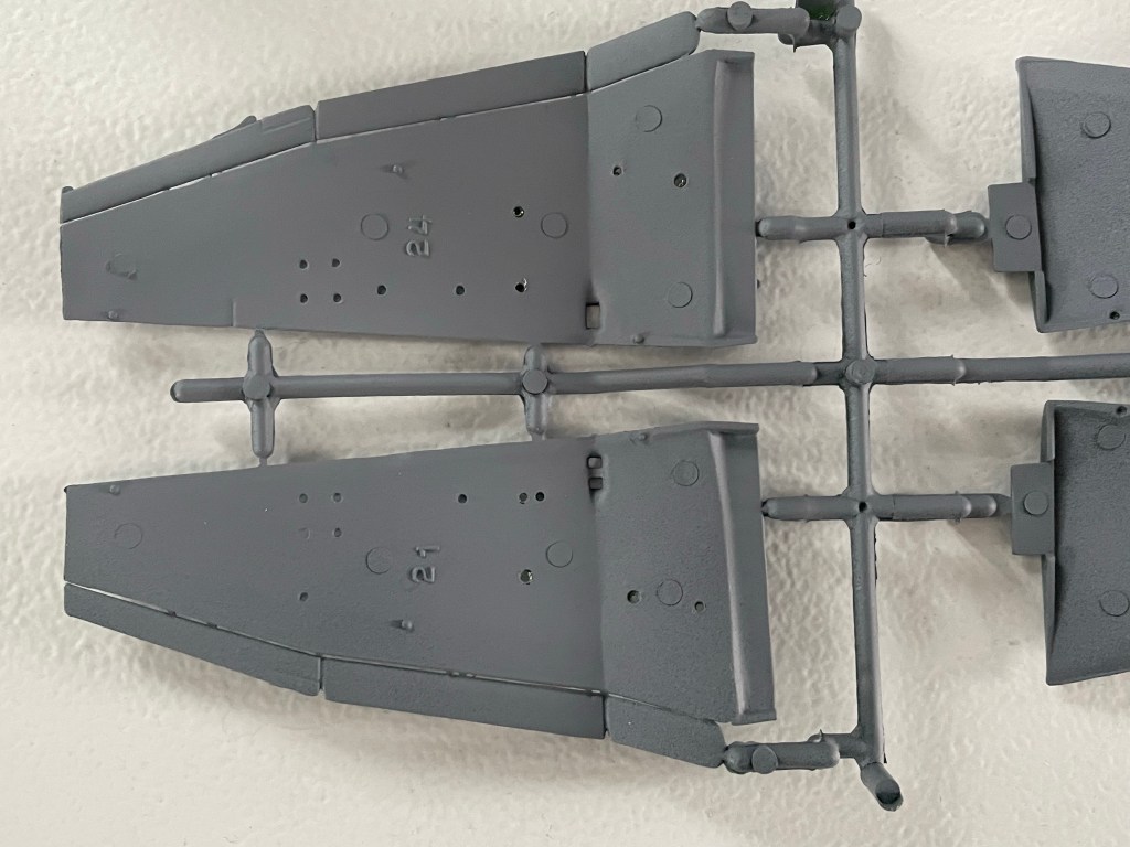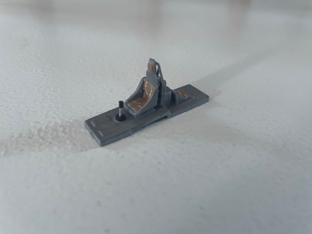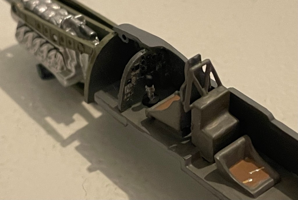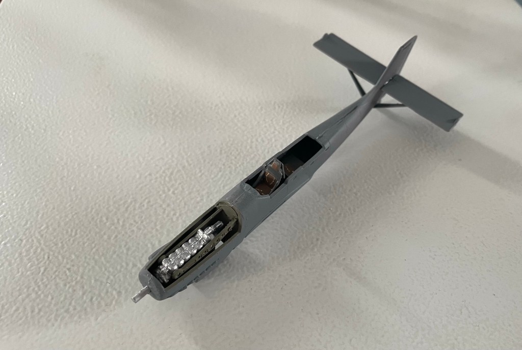 After adding and painting the engine mounts I could fit the cockpit and engine into one half of the fuselage. I’ve painted the sides of the cockpit the matching Cold Grey and the engine bay (and mounts) Green Grey.