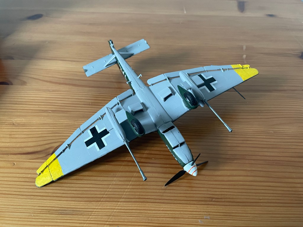 The paint scheme for this was pretty straightforward. Luftwaffe Camo Green on top, Sky Grey underneath with yellow wing tips.
