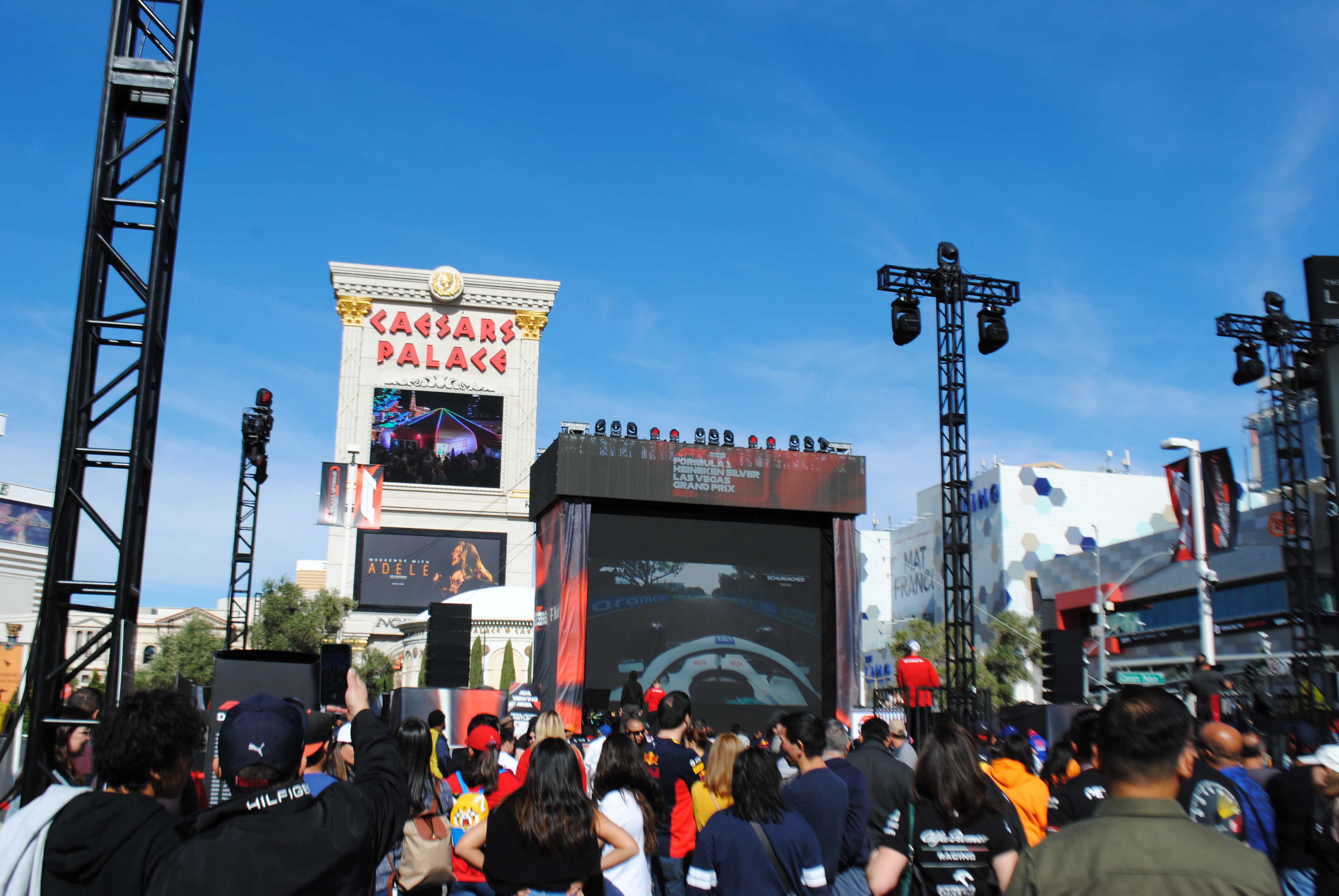 At the center of the event was this stage and huge screen. During the day it was showing a replay of (if I recall correctly) the Mexican Grand Prix. In the evening The Killers played a set.