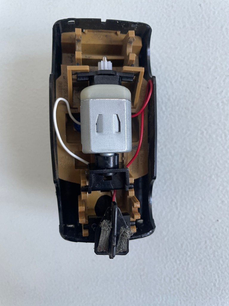 The Mabuchi and mounts were a bit of a tight fit but we made it work! The Mabuchi has tabs that the wires solder onto at the top of the motor. I’m guessing the original car must have had a different set up as these tabs were pressing against the interior of the car. If you’re doing a similar conversion, bend those tabs down as far as they can go and make sure you solder a neat, flat joint.
