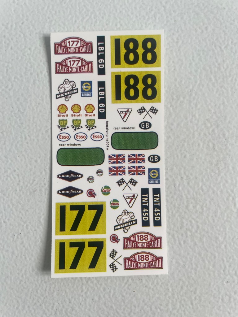 For decals I got this set of BMC Works rally team liveries. I’m going to do the 177 car which was driven by Rauno Aaltonen and Harry Liddon. It won the Monte Carlo Rally of 1967.