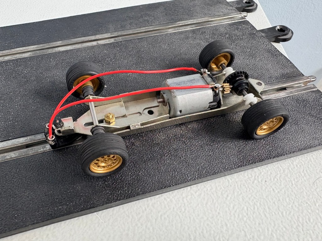The chassis is a Penelope Pitlane F1Rm with a standard Mabuchi motor (I assume Scalextric but I couldn’t be 100% sure, a Scalextric black rear gear, nylon bearings and the gold wheels that came on the car (with new tyres on the back).