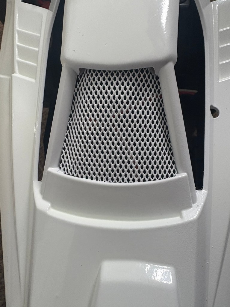 The aluminium mesh windscreen was cut to shape and hot glued to the inside of the shell before painting.