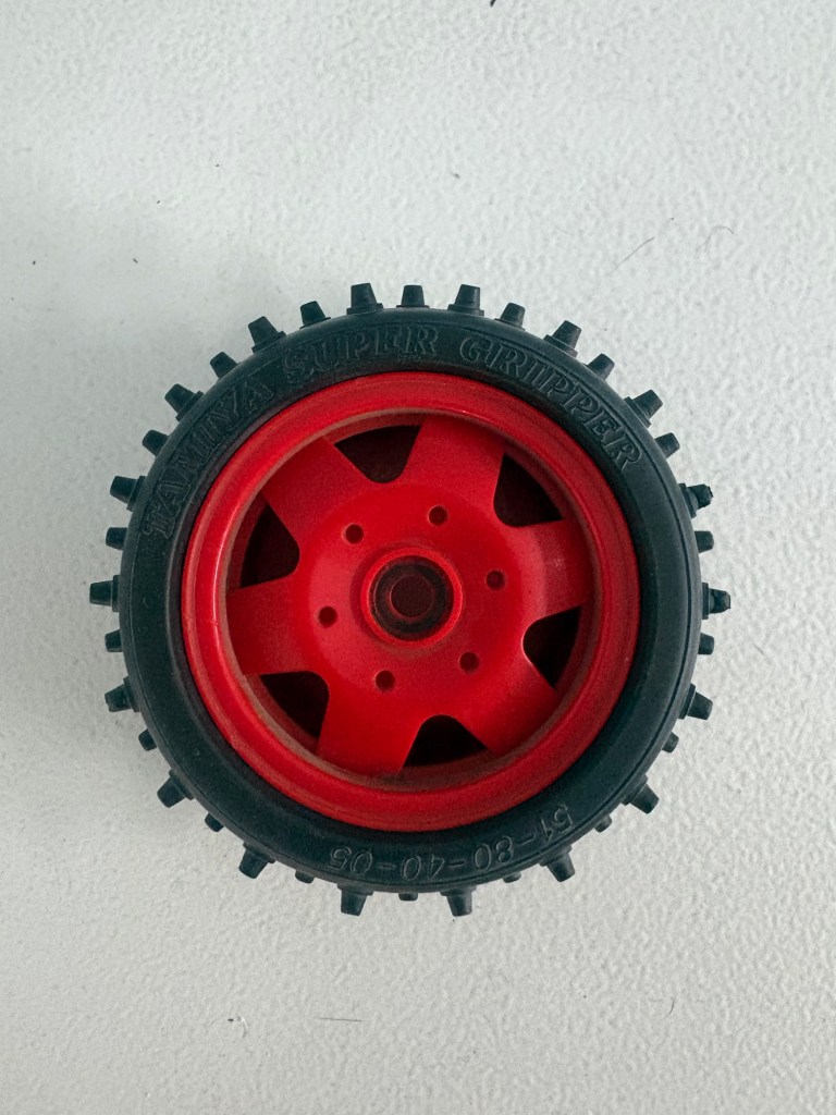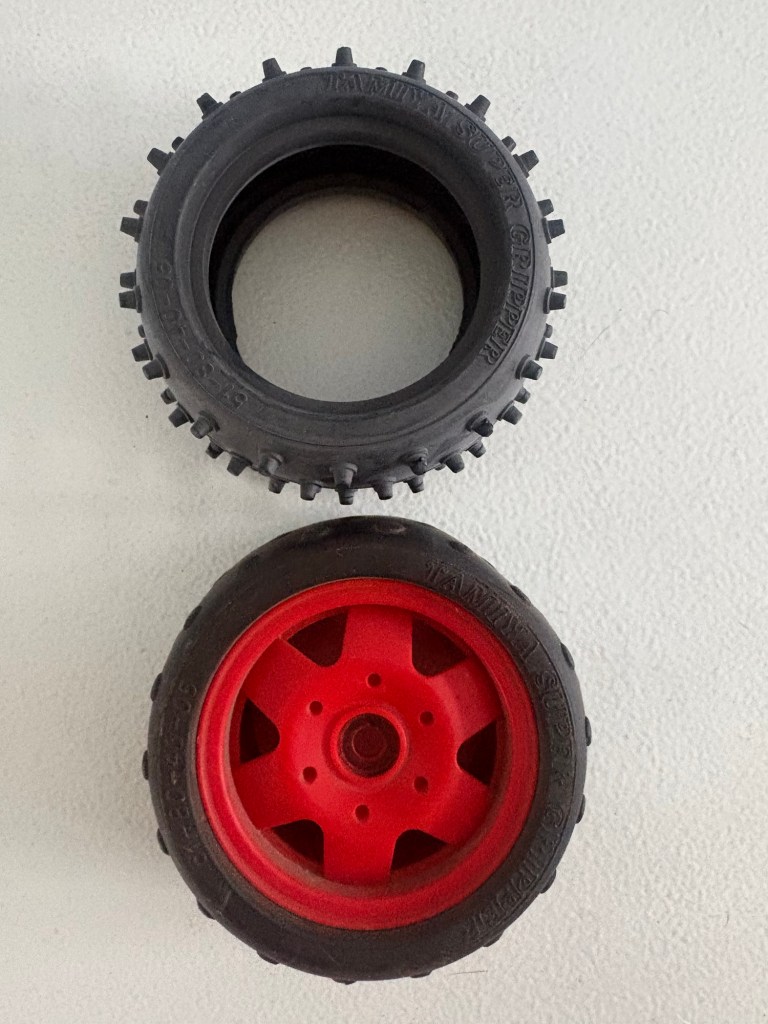 The replacement tyres arrived. They aren’t listed in the instructions but are Tamiya part 53059. If you’re skimming through this, the link to an online copy of the manual is further up if you need it.