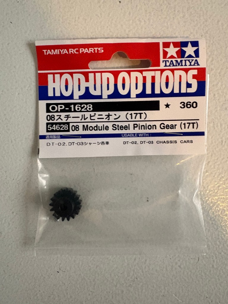 It is worth noting that the pinion is an unusual size on this car. A lot of 1/10 and 1/12 RC cars have a 0.6 module pinion, this chassis has a 0.8 which is noticeably bigger in diameter.