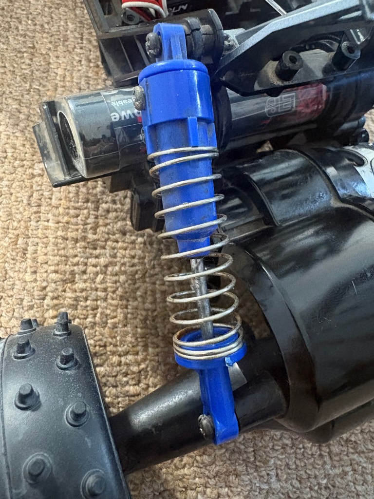 Here’s that broken shock absorber. Aftermarket oil filled shock absorbers are available for these, and are probably a sensible purchase, but the standard shock absorber bits are readily available (albeit for the DT-02) and were much cheaper. So I opted to rebuild the standard ones.